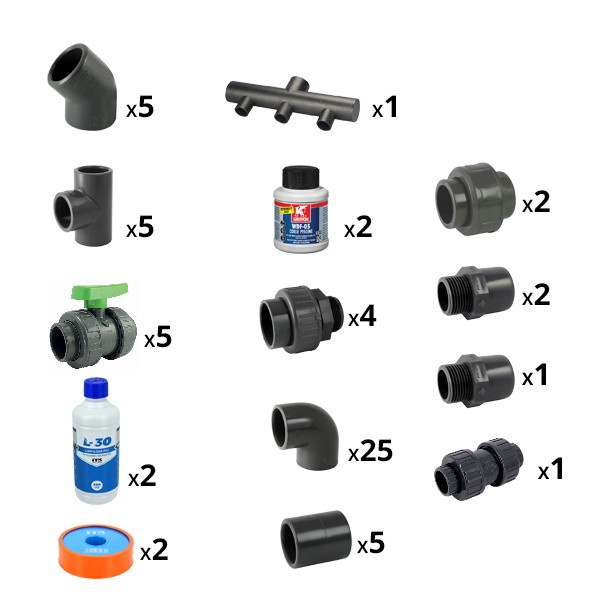 Ce kit plomberie que vous retrouvez dans notre menu raccord PVC pression rassemble tous les raccords et produits dont vous avez besoin pour une bonne installation. Centrocom a sélectionné parmi ses fournisseurs, le meilleur des produits afin de vous proposer un kit complet. Vous devez savoir que le collecteur relie toutes les vannes à l'aspiration comme la prise balai, la bon de fond et les skimmers. Vous devrez équiper votre bonde de fond et vos skimmers avec un embout fileté réduit. Et les raccords union seront positionnés sur le filtre et la pompe de filtration.