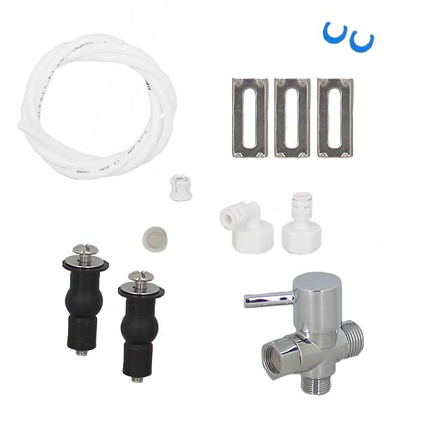- Platine de fixation, - 1 robinet 3 voies, - Jeu de 2 boulons expansifs, - Jeu de 2 platines d'ajustement en métal, - Tuyau de raccordement à connexion rapide, - T de raccordement en métal avec robinet d'arrêt et maille filtrante, - Jeu de 2 rondelles d'étanchéité, - Jeu de 2 clips de fixation, - Télécommande et ses piles (pour les modèles Luxe Silver V2 et Luxe Silver et Gold Connect)